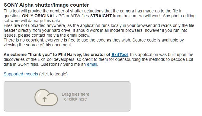 Für das Auslesen des Shutter Count der Sony A7R III muss lediglich die letzte Bilddatei per drag and drop auf die Seite http://tools.science.si gezogen werden. Das online Tool liest nun den Wert des Image Count Attribute aus und zeigt es auf der Seite an. Wenn ihr nicht alle eure Daten dieser Seite preisgeben wollt, so könnt ihr euren Copyright Eintrag in eurer Kamera, sofern er denn mit eurem Namen versehen ist, zuvor löschen. Ebenfalls könnt ihr ja ein schwarzes Bild mit Objektivdeckel auf dem Objektiv schießen und dieses zum hochladen verwenden.