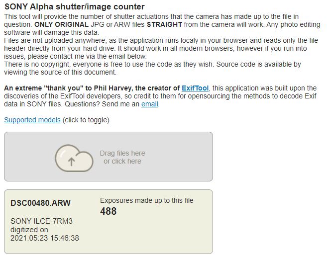 Und so schaut die Seite aus, wenn Du das Bild in das Feld “gedroppt” hast. Es wird dir direkt der Shutter Count deiner Sony A7R III angezeigt. In meinem Fall sind es bisher nur 488 Auslösungen. Liegt aber auch daran, dass meine Kamera neu ist und ich gerade erst auf Sony umgestiegen bin.